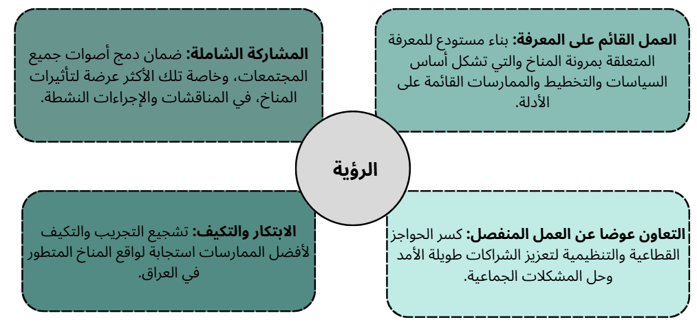 تحيط بالرؤية أربع ركائز رئيسية، يُكمل كل منها الآخر في دعم وبناء مرونة المناخ في العراق، بما يحقق تحولاً مستداماً وشاملاً نحو مستقبل أكثر قدرة على التكيّف مع التغيرات المناخية.